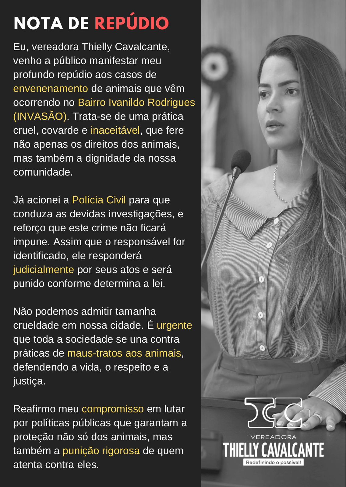 Por fim, Thielly Cavalcante reafirmou seu compromisso em lutar por políticas públicas de proteção animal e pela punição rigorosa de quem comete esse tipo de crime.
